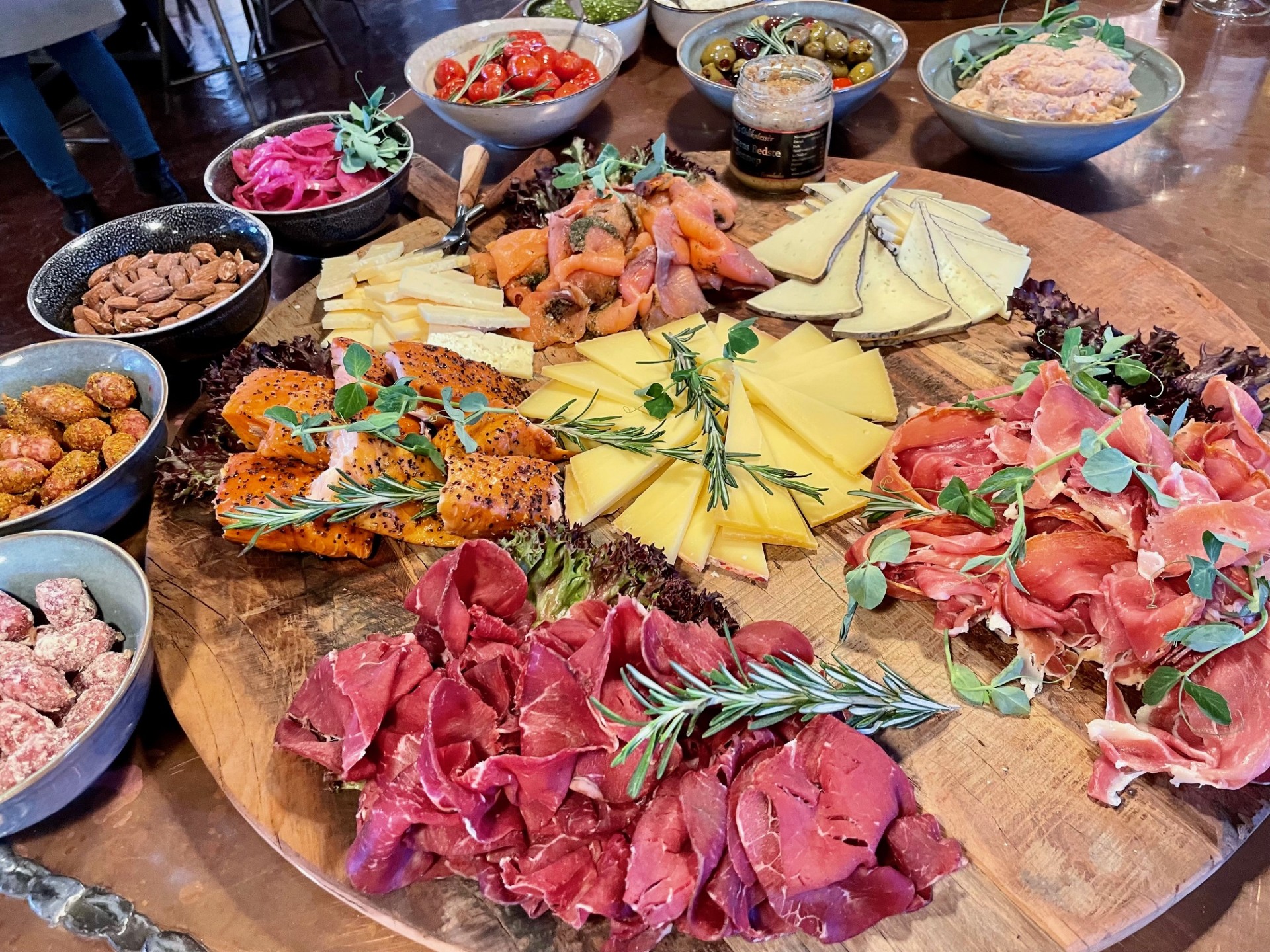 Tapasbuffet indeholdende 3 udvalgte italienske charcuteri, 3 udvalgte oste, fiskerilette, varme oksekødboller i tomatsovs med frisk basilikum, sliders med mør okse (eller crispy chicken), friterede torpedorejer, brød, aioli og pesto. PRIS PER PERSON (min. 12 personer) 295,- kr.